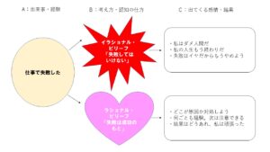 Bは信念と書いていますが、ABC理論では価値観・解釈などの思い込みや先入観、決めつけなど、無意識で起こる「考え方・捉え方」のこと。